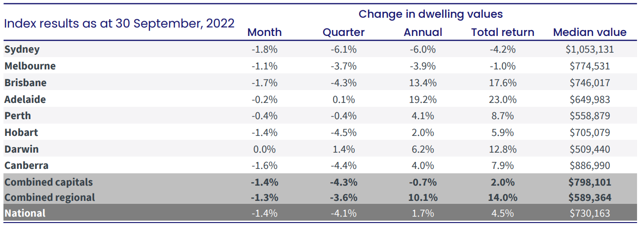 Regional markets also registered a fall, with median dwelling values down 1.3%.