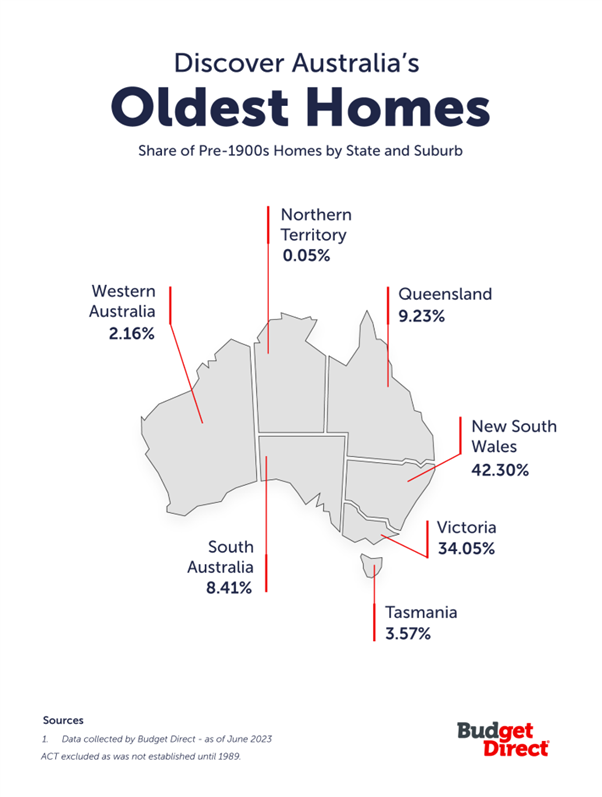 According to the data as of June 2023, New South Wales has the greatest share of pre-1900s homes at 42.30%, followed by Victoria (34.05%).
