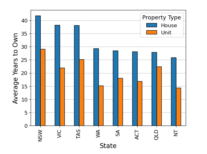 For units, New South Wales, Tasmania and Queensland had the highest “years to own”.