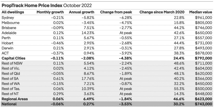 According to PropTrack Home Price Index for October 2022, national dwelling prices fell by only 0.06% over the month, the smallest decline since the national home prices peaked in March 2022.