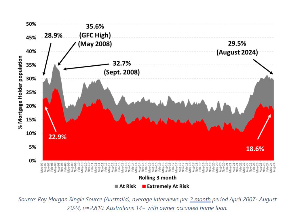 - More than 1.4 million Australian home loan holders were considered 'at risk' of mortgage stress as of mid-2025 - Roy Morgan research found